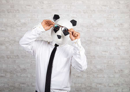 Photo of secretive incognito guy hands close eyes wear panda mask black tuxedo isolated on green color background