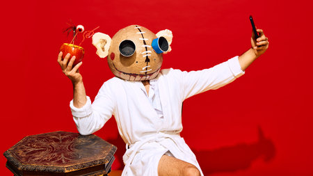 Person wearing creepy mask and bathrobe, sitting on chair and taking selfie with drink in hand against vibrant red background