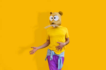 Cool man wearing 3d origami mask with stylish colored clothes - Creative concept for advertising, animal head mask doing funny things on colorful background
