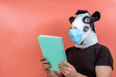 person wearing a cow mask and surgical mask taking notes with a pen on a notepad with pink background