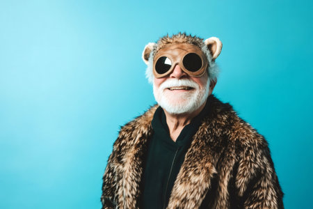 Cheerful senior man wearing a whimsical otter costume and playful goggles, smiling joyfully against a vibrant blue background