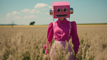 an android girl, dressed in a pink robot outfit, poses in a wheat field. this social media-style portrait combines elements of cubo-futurism, lomography lady grey, working-class empathy, flowerpunk, and konica auto s3. the vibrant image showcases the android's unique style and the beauty of nature, while also incorporating the futuristic concept of rtx on., ai generated