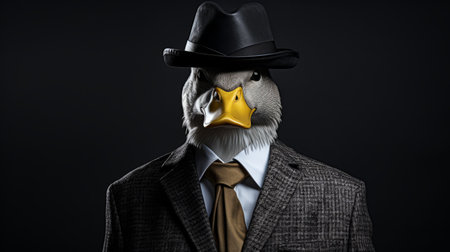 a doctor who character is depicted in this contemporary realist portrait photograph. the doctor is seen wearing an elegant suit paired with a unique chicago bird helmet. the image showcases a dark silver and yellow color scheme, reminiscent of the farm security administration aesthetics. the high-definition image captures the essence of duckcore, featuring characterized animals and stylish clothing. ai generated