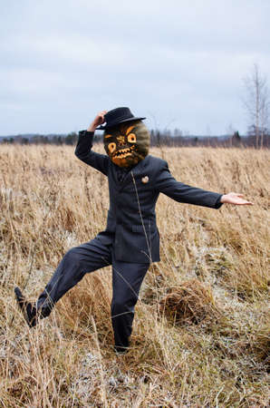 man in a fancy dress celebrates Halloween in an autumn field among dry grasses