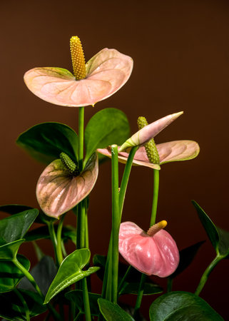 A vibrant cluster of anthurium flowers, in shades of pink and pale green, with unique spadixes and glossy leaves against a simple brown backdrop
