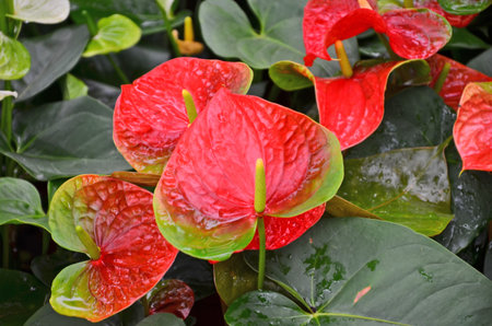 Beautiful flowers of anthurium red Flamingo, flowers or Boy flowers Pigtail Anthurium in botanic garden (Anthurium andraeanum, Araceae or Arum)