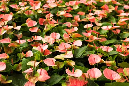 Close up of pink Pigtail Anthurium flowers or Flamingo flowers are blooming with sunlight and shadow on green leaves surface