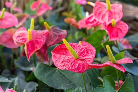 Pink and red anthurium flowers with green leaves are creating a vibrant display in a botanical garden setting