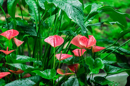 Beautiful tropical red anthurium flowers with rain drops in the garden