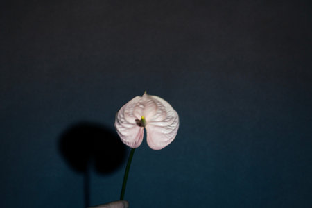 Beautiful purple Anthurium on a grey grunge background. Trendy minimalistic background.
