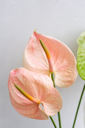 pink and green Anthurium. Light gray background, glass vase. Wallpaper, flowers texture
