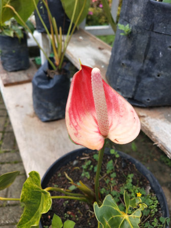 The beautiful red Anthurium flowers bloomed brightly in the urban garden