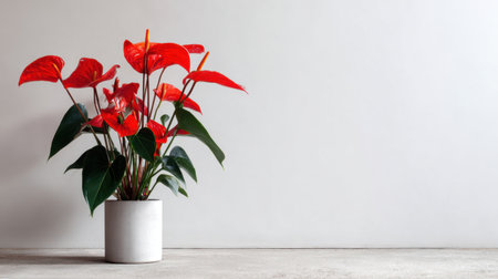 A stunning display of a vibrant red anthurium plant in a chic white pot, set against a minimalist wall background, perfect for modern interior decor.