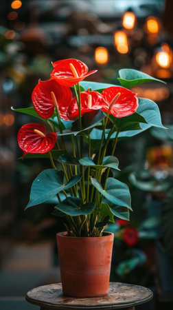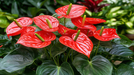 A striking display of vibrant red anthurium flowers surrounded by lush green foliage. Perfect for adding a touch of tropical beauty to any environment.