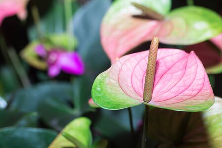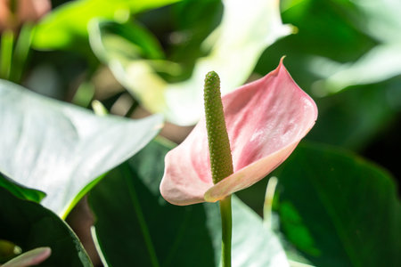 Close up of pink Pigtail Anthurium flowers or Flamingo flowers are blooming with sunlight and shadow on green leaves surface