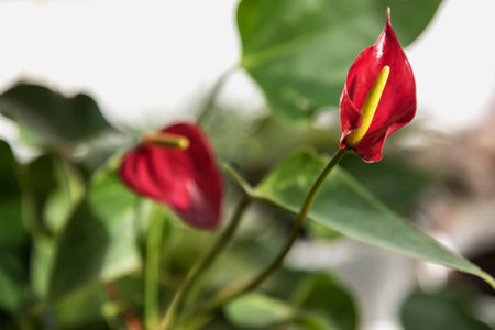 Close up red flower of anthurium flower also called flamingo flower with big green leaf in front of white curtain in living room in sunlight, Germany