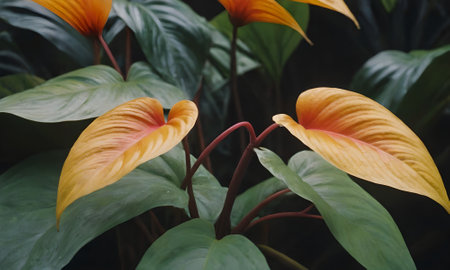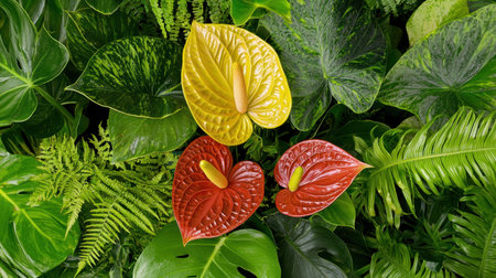 This vibrant image showcases colorful anthurium flowers nestled among lush tropical leaves, creating a serene and exotic botanical scene. Perfect for nature-themed projects.