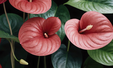 A stunning close-up of vibrant pink anthurium flowers surrounded by lush green leaves, ideal for home decor, floral arrangements, and nature lovers.