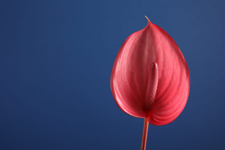 a captivating analog photograph showcasing a solitary anthurium flower against a deep blue wall. soft, natural evening light bathes the scene, creating a dreamy and slightly blurred aesthetic with visible film grain. ai generated