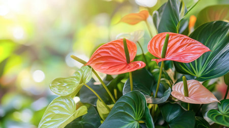 A close-up image of vibrant anthurium plants featuring glossy leaves and bright blooms, illuminated by soft natural light for a fresh and tranquil atmosphere.