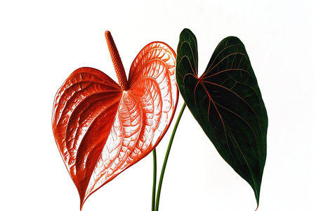 Stunning leaves of anthurium plant showcasing bright red and dark green colors on a clean white background. Ideal for decor and artistry.