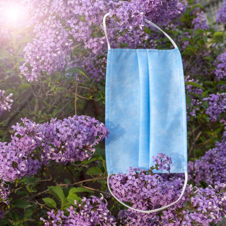 Medical mask and flowers on the branches of lilac.