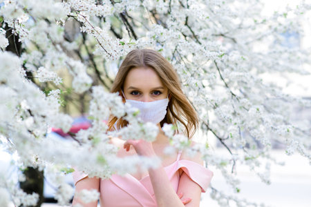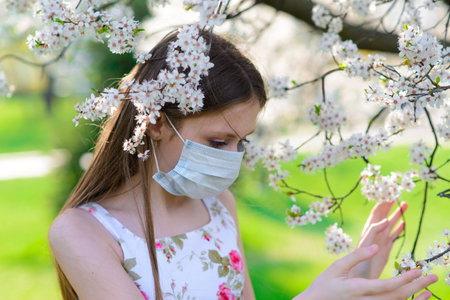 A girl in a protective medical mask in the spring among the blooming garden. . Spring allergy and covid concept.