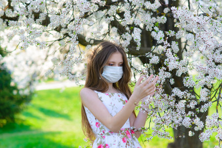 Lonely teenage girl wearing protection medicine mask against virus covid and allergy enjoying spring flower blossom in blooming garden