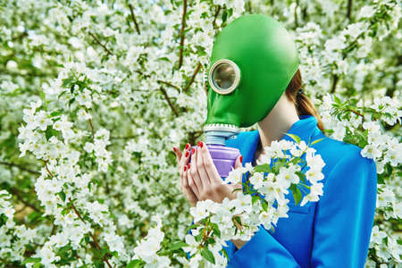 A woman in blue jacket and green gas mask stands in a blossoming apple orchard on a clear spring day. Air pollution, environmental disaster.