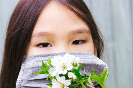 Close up portrait of an Asian girl in medical mask trying to smell spring flowers