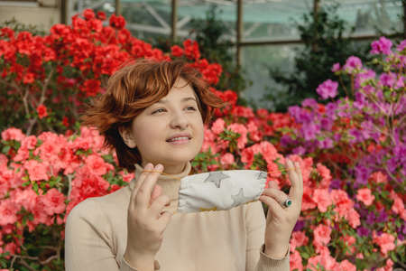 Redhead woman has taken off medical mask and is sniffing the first spring leaves. Concept of ending the quarantine and isolation from the flu virus
