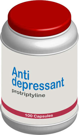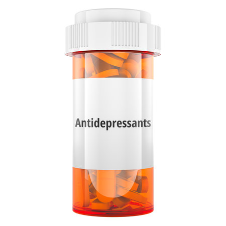 Antidepressants pharmacy bottle full of pills with label. 3D rendering isolated on white background