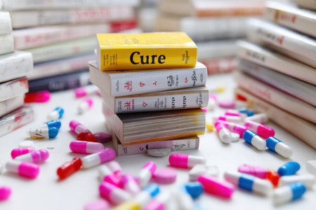A stack of books titled Cure is surrounded by a vibrant mix of colorful pills that highlight themes of health and wellness in a lively setting.