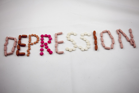 Writing Depression on label. Label with text Depression and medicines, pills.