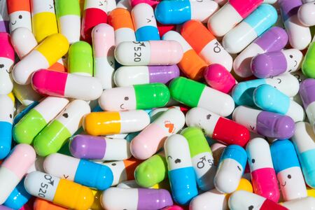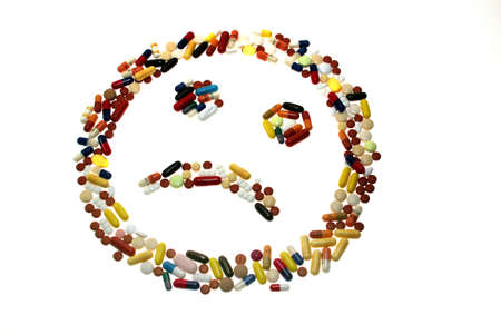 Background of colorful multi-vitamin pills, tablets and capsules .With a sad emoji.