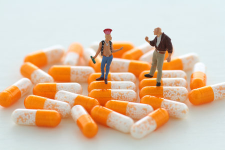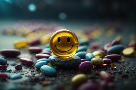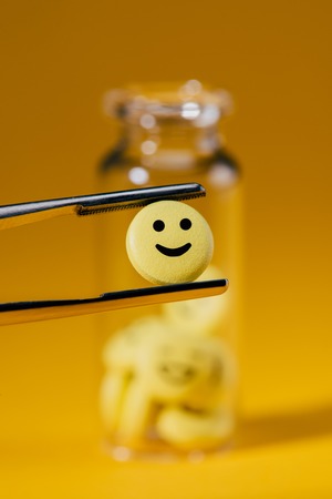 close-up shot of pill with smiley face in tweezers and glass bottle on yellow
