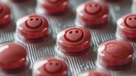 Smiling red emoticons on a blister pack. Shallow depth of field