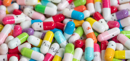 medicine pharmacy pills background for medical healthcare concept,top view,magenta purple tone