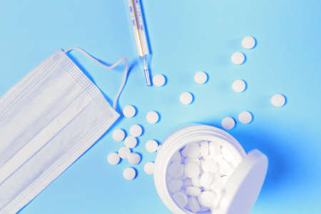 Medicine and health concept. Pills, thermometer and medical mask on a blue background. Place for your text.