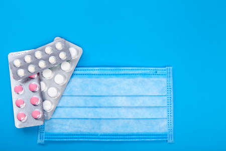 medical face mask with a blister with pills on a blue background top view with copy space.
