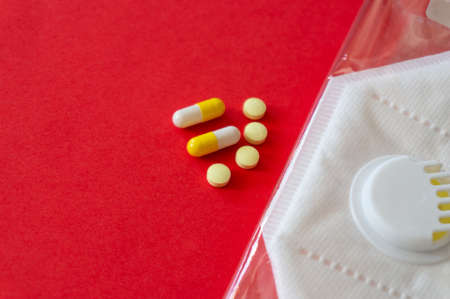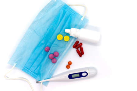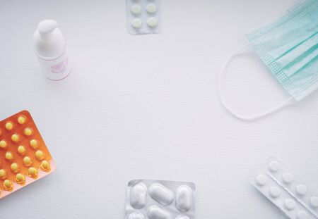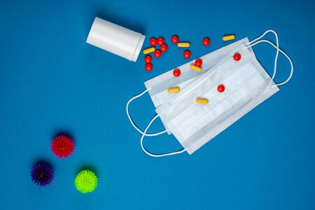 Variety pills from white box and surgical mask with rubber ear straps. Coronavirus 2019-ncov epidemic concept. Procedure mask from bacteria. Protection concept.