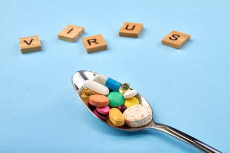 Close up steel spoon with various medicine pills. Antivirus tablets on blue background.