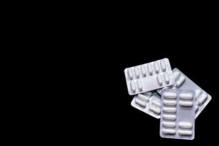 Medicine, health care and health concept - white pills in silver packs on a black background, isolate, copy space