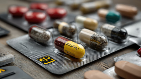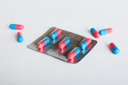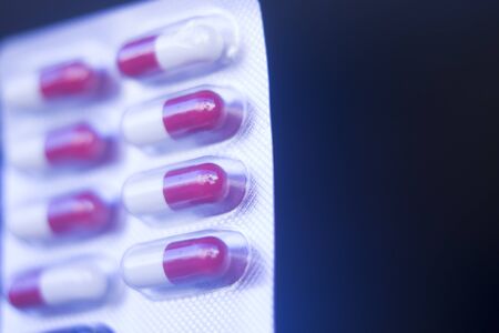 pharmaceuticals antibiotics pills medicine colorful antibacterials pills on blue background
