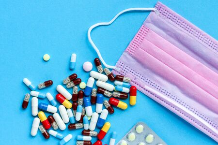 On a blue background, multicolored pills and a pink medical mask. The medicine concept. Multicolored medicines background. Different remedy, pills, capsule, antibiotic and vitamin.