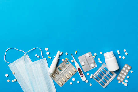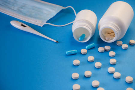 ampoules, blisters with pills and capsules and medical protective masks on a blue background copy space