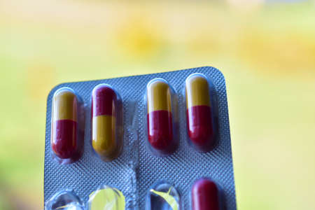 Blisters with pills, for health and protection. Yellow color with green capsules, white, sealed in silver packages on a blue background. Slimming, anti-aging or anti-virus products. Contraceptive