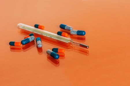 Close view of a thermometer with high fever. An out of focus background of colorful medicine