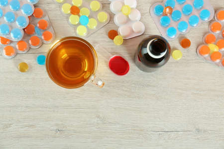 Flat lay composition with cough syrup, lozenges and cup of tea on white wooden table, space for text