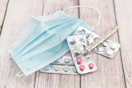 Protective face masks or surgical masks, medicine pills and thermometer on table background. coronavirus disease. Corona virus concept. Space for text.